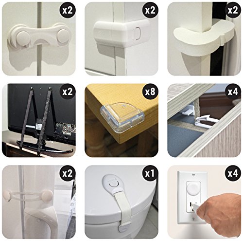 Cheraboo Toddler Home Safety Kit - Best Child Protection Pack For Kitchen Cupboard Locks, Corner Guards and Anti Tip TV/Furniture Straps - Large 27 Piece Baby Proofing Set.Features: STRONG! Cabinet locks enabling you to lock your kitchen cabinets, appliances, drawers and even your toilet seat with our simple to use yet very effective multipurpose quick release locks. Five types of locks to choose from for best application, no tools or screws required., EFFECTIVE! Door finger guards, stops your child getting finger pinch injuries, being locked accidentally in a room or the door slamming shut thanks to our soft impact door stoppers., EXCELLENT! TV / furniture straps ensures you can stop your television or furniture being pulled over. Our furniture anti-tip straps are fully adjustable and come with fittings and screws included., DELIVERS! Table corner guards provides you the ability to protect sharp corner edges with cushioned rubber that simply affix to any surface by the application of 3M high adhesive tape. Allowing safer playtime throughout your house. No screws or drilling required., DEPENDABLE! Electrical outlet caps allowing you to cover up unused electrical sockets to guard against inquisitive little fingers! Act now, get your home child proofing kit and make your house a safer environment for your children. Makes a great baby shower gift! - GRAB IT NOW - MASSIVE LAUNCH SALE NOW ON TODAY. The Cheraboo Home Safety kit is for every anyone needing to child proof their home to make their home safer for toddlers but can't find a complete kit to do it!