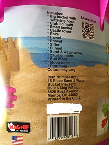 Features: INCLUDES: Big bucket with watering hose; Crab Lid mold; Small bucket; Castle Tower; Rake; Trowel; Shovel; Shifter; Funnel; Sand & water wheel; 2 turtle molds; Sun mold; Moon mold; Star mold., Proprietary design, Exceptional performance