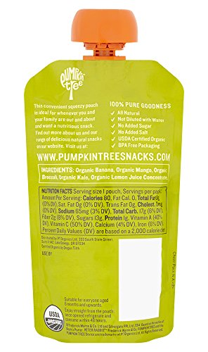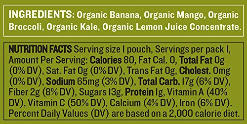 Features: Ingredients: Organic Banana, Organic Mango, Organic Broccoli, Organic Kale, Organic Lemon Juice Concentrate., USDA Certified Organic, Convenient squeezable pouch, no need to chill, Nothing artificial & Not diluted with water, BPA free packing