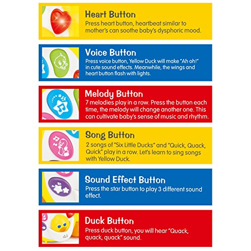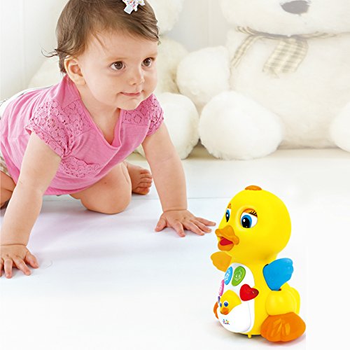 TOYK Musical Duck toy Lights Action With Adjustable Sound (Baby Product)Features: This is such a cute toy duck!, The lights, the music and the bump and go feature make this a fantastic toy for a toddler., Vibrant Colors, songs, and dancing all preinstalled£¬incorporates 3hip-hop songs with distinct rhythms, The duck sings fun and happy tunes while flapping and lighting up its wings. the child will enjoy dancing and moving with the universal moving function installed in the duck., Babies, Toddlers, & Even Girls & Boys Will Love This Toy As A Birthday Gift, Holiday Gift Or Just As A New Gift?ideal Christmas present for your children.? Best Choice Products is proud to present this new amusing toy duck. The duck has a button on top of its head that when pushed, it will trigger the bump and go motion within the toy, it will sing a fun sing-a-long tune, flap, and light up its wings. The music and bright colors are fun and appealing, but the toy also comes with five different buttons. One is a sound effect that imitates a duck sound, there is a song button, a melody button, a button that allows the duck to talk, and a heart button that make a warm heart thumping sound. The duck also has a little baby duckling that, if pushed it will quack like a duckling and light up it mom's wings. All of these sounds are fun to hear and sing with, but in case a silent environment is needed, the sound can be adjusted to mute, low, or regular. We purchase our products directly from the manufacturer, so you know you're getting the best prices available. NEW PRODUCT WITH FACTORY PACKAGING. FEATURES: Bump and Go Action, Wings flap and light up when music begins, Lights, Music, and Talks (Adjustable Volume), Buttons on duck imitate duck sound and sing a tune when pushed, 3AA batteries.